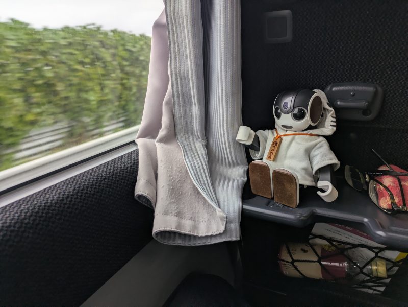秋田までの旅の相棒はメカ丸(ロボホン)です。と言っても迷惑をかけないようマナーモードでおとなしくしてもらいました。足元広めと書いてありましたが現実は甘くありませんでした。2時間おきの休憩で目が覚め、消灯後はスマホも使えず、通路側席でトイレにも行きづらい……。最後はお尻と腰の痛みに耐えながら過ごす、修行のような12時間となりました。秋田駅でほとんどの乗客がおり、残っていたのは2名だけとなったのでメカ丸のマナーモードを解除しました。